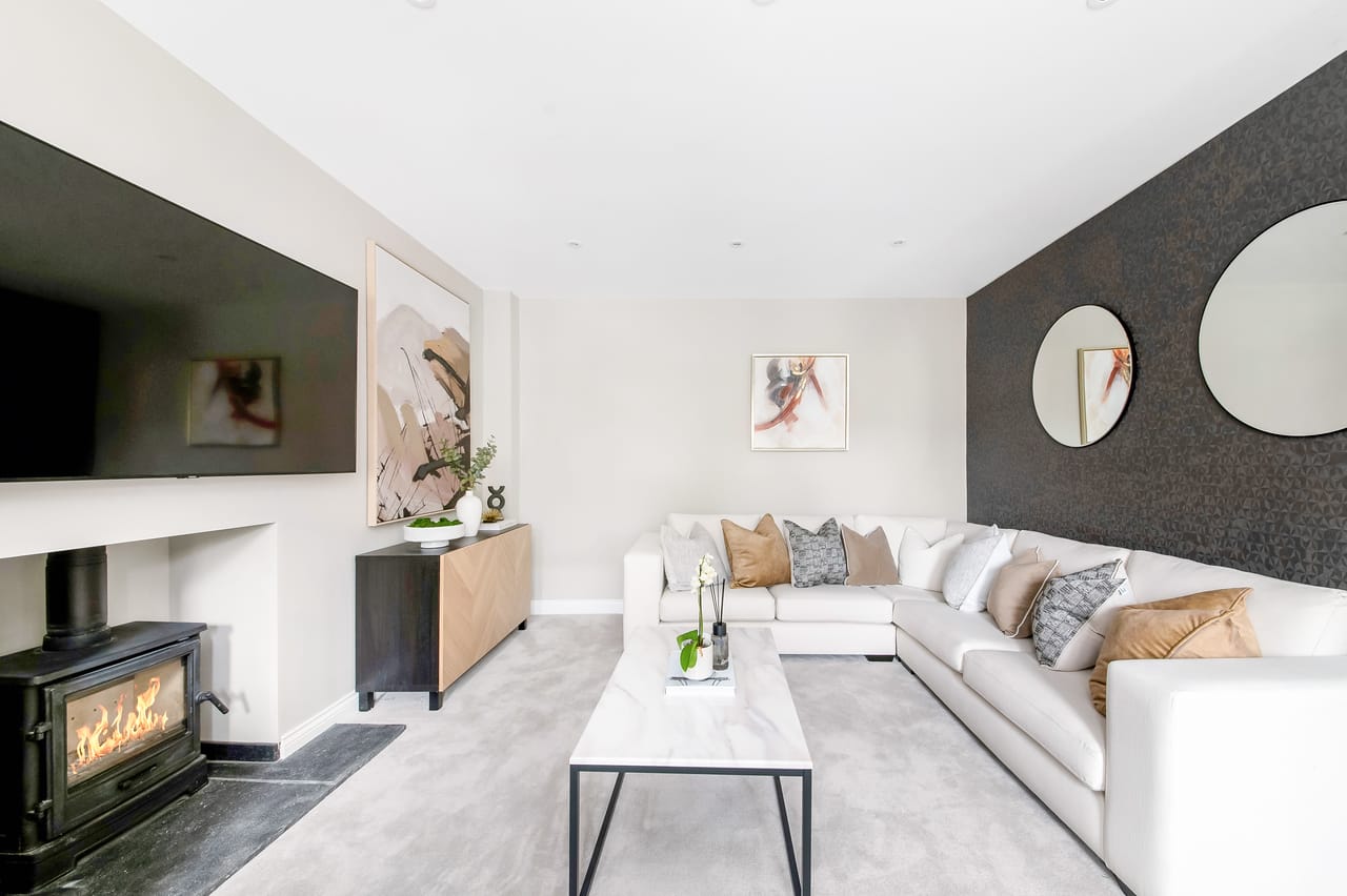 Large living room with log burner