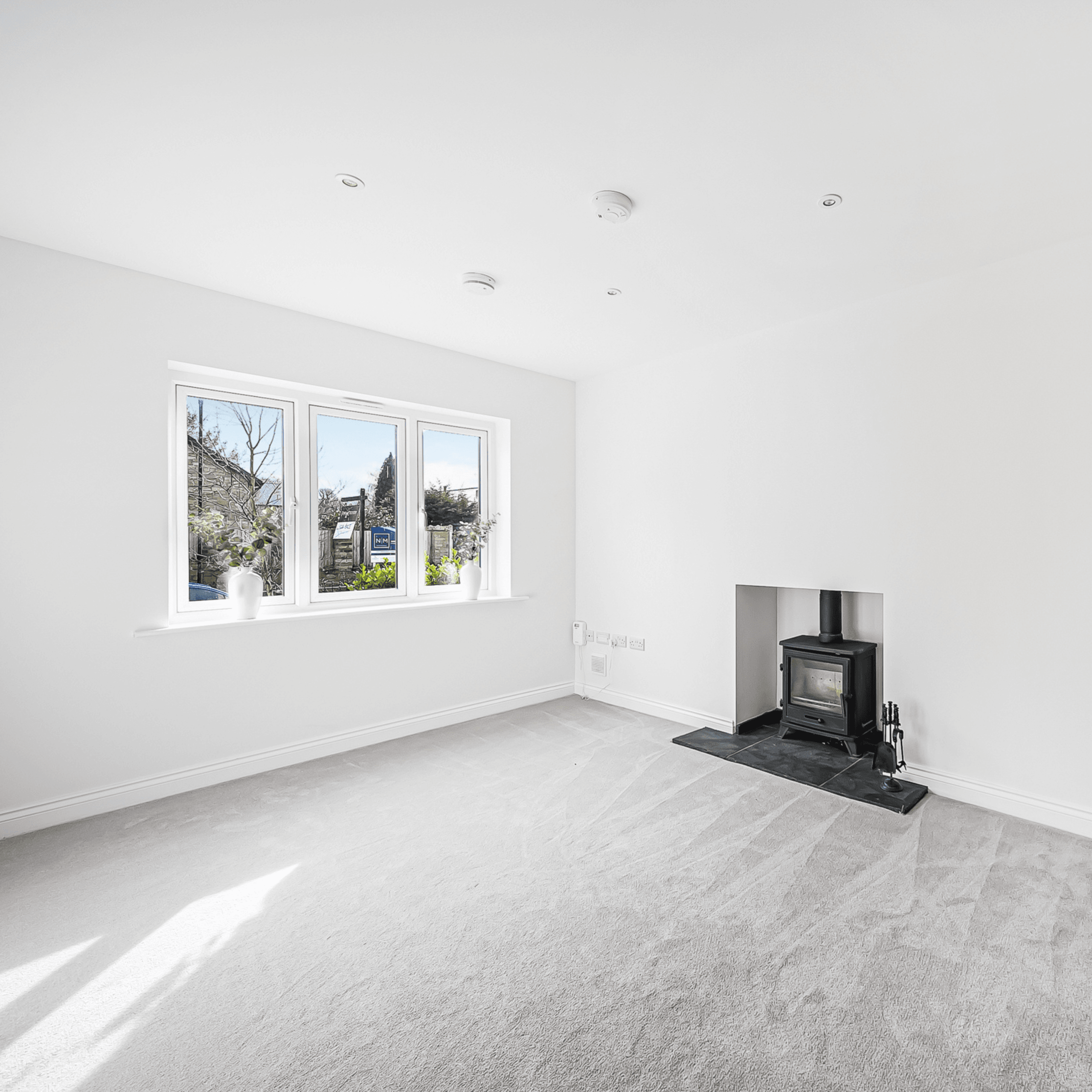Large living room with log burner